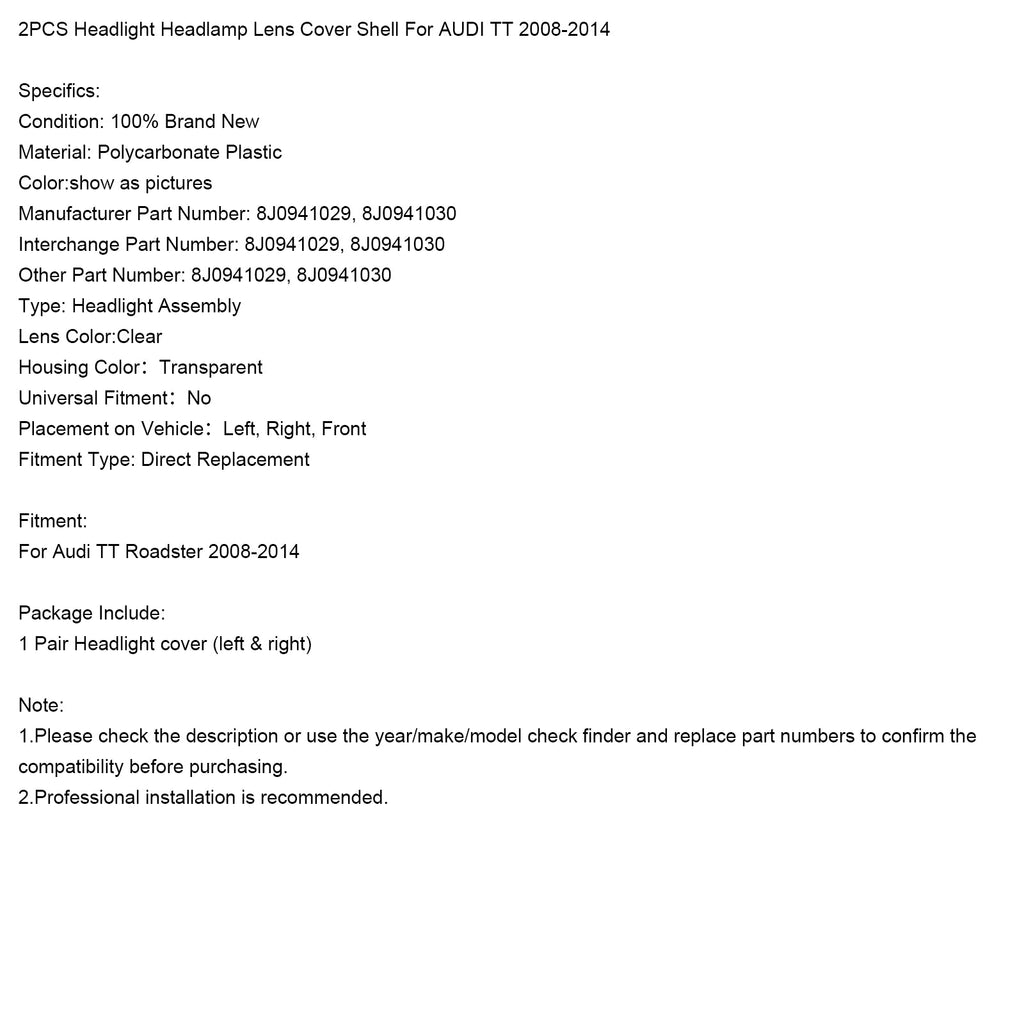 2008-2014 AUDI TT 2PCS Headlight Headlamp Lens Cover Shell
