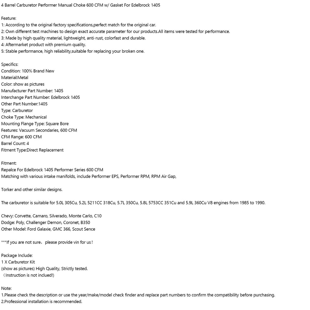 Repalce For Edelbrock 1405 Performer Series 600 CFM