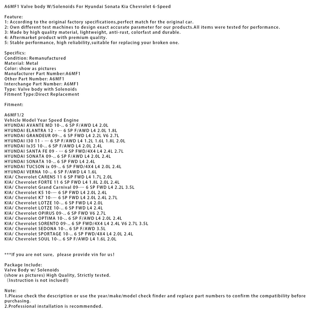 A6MF1 A6LF1/2/3 Valve body W/Solenoids For Hyundai Sonata Kia Chevrolet 6-Speed