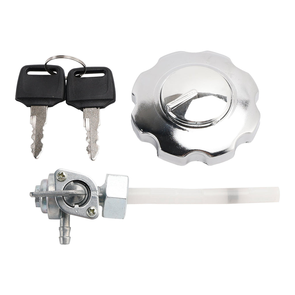 Includes chrome locking gas cap with keys and a petcock for use with 3/16" in fuel line.