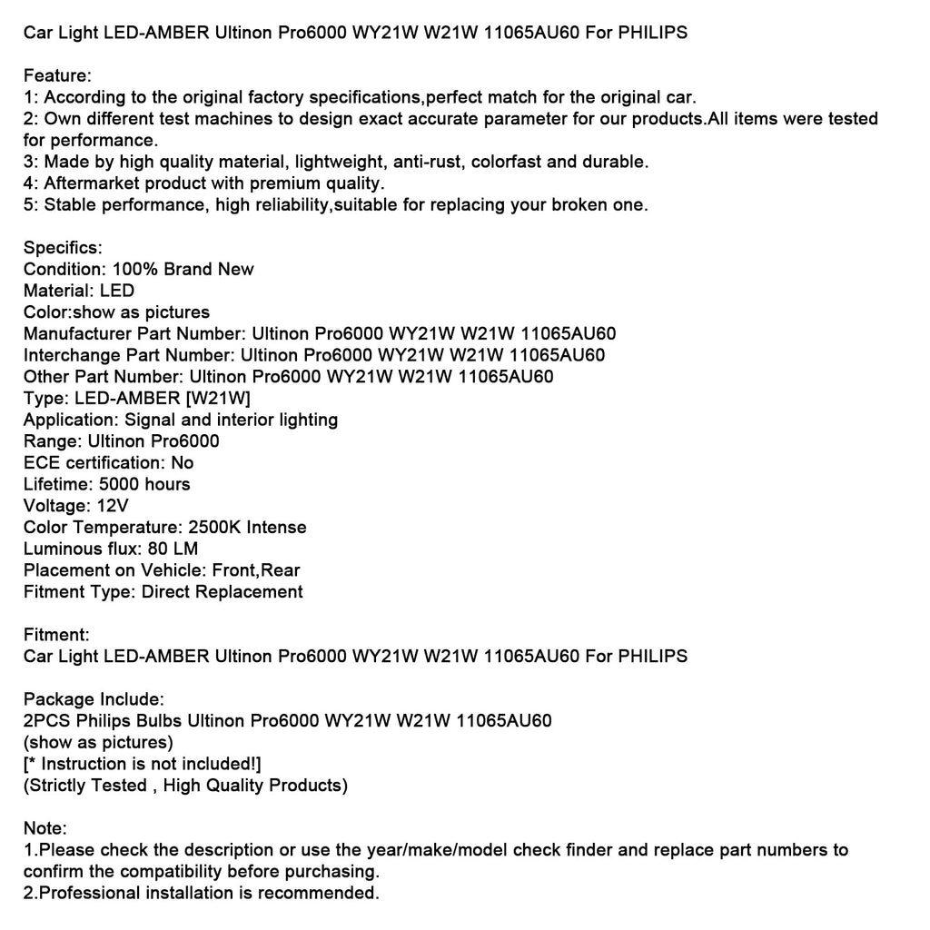 Car Light LED-AMBER Ultinon Pro6000 WY21W W21W 11065AU60 For PHILIPS