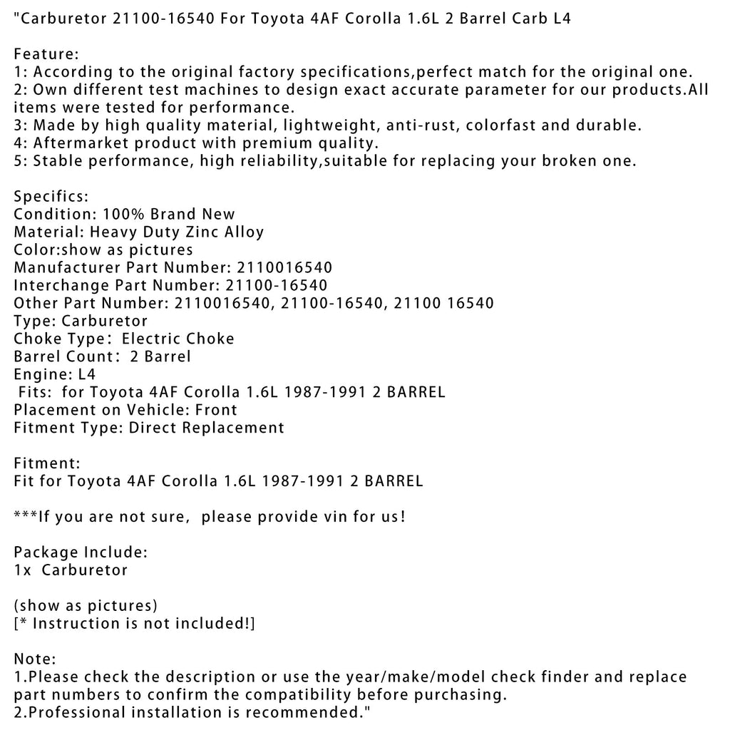Fits: for Toyota 4AF Corolla 1.6L 1987-1991 2 BARREL