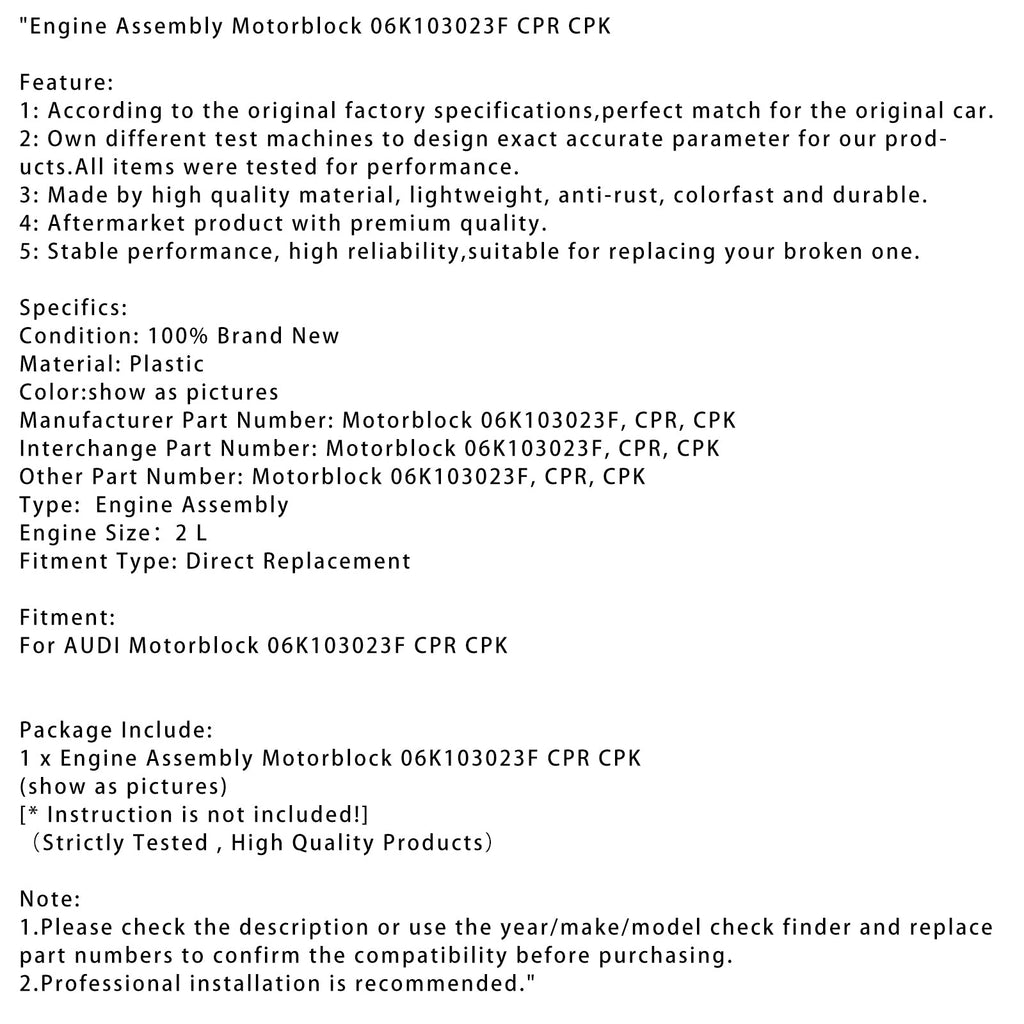Manufacturer Part Number: Motorblock 06K103023F, CPR, CPK