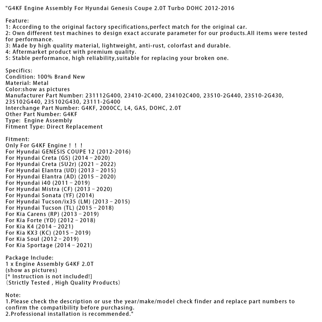 Interchange Part Number: G4KF, 2000CC, L4, GAS, DOHC, 2.0T