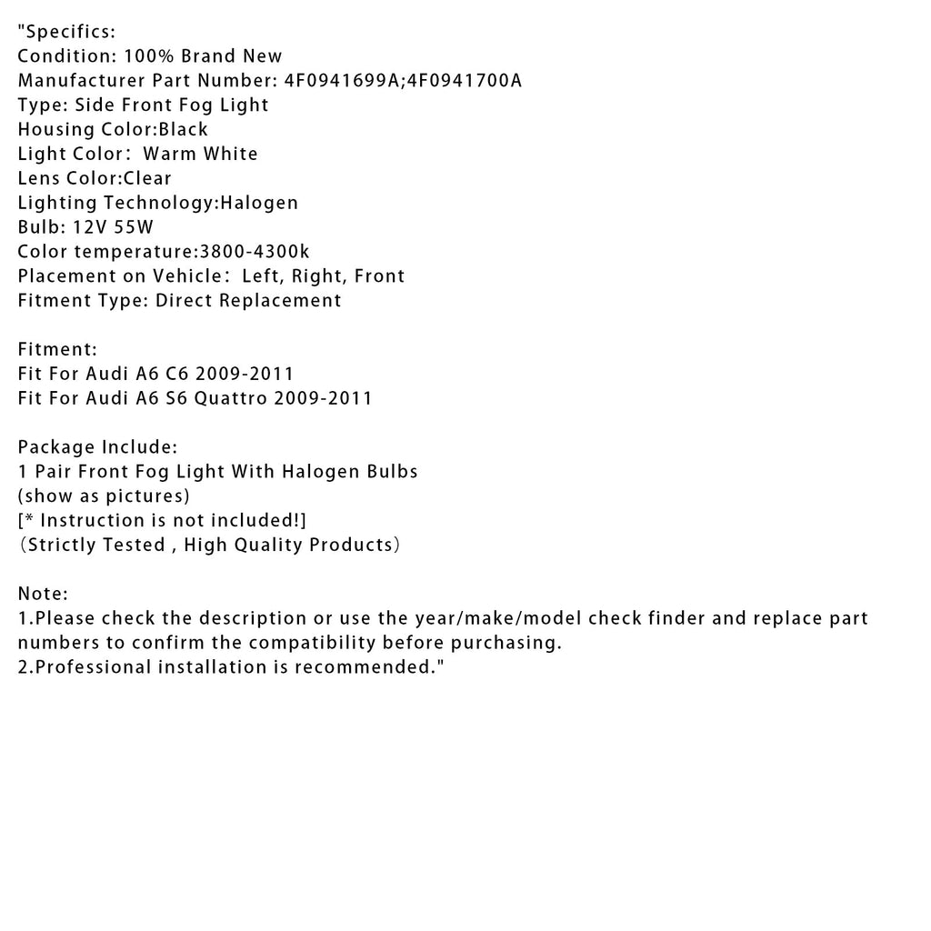 Pair Front Bumper Driving Fog Light Lamps For Audi A6 Avant 4F C6 2009-2011