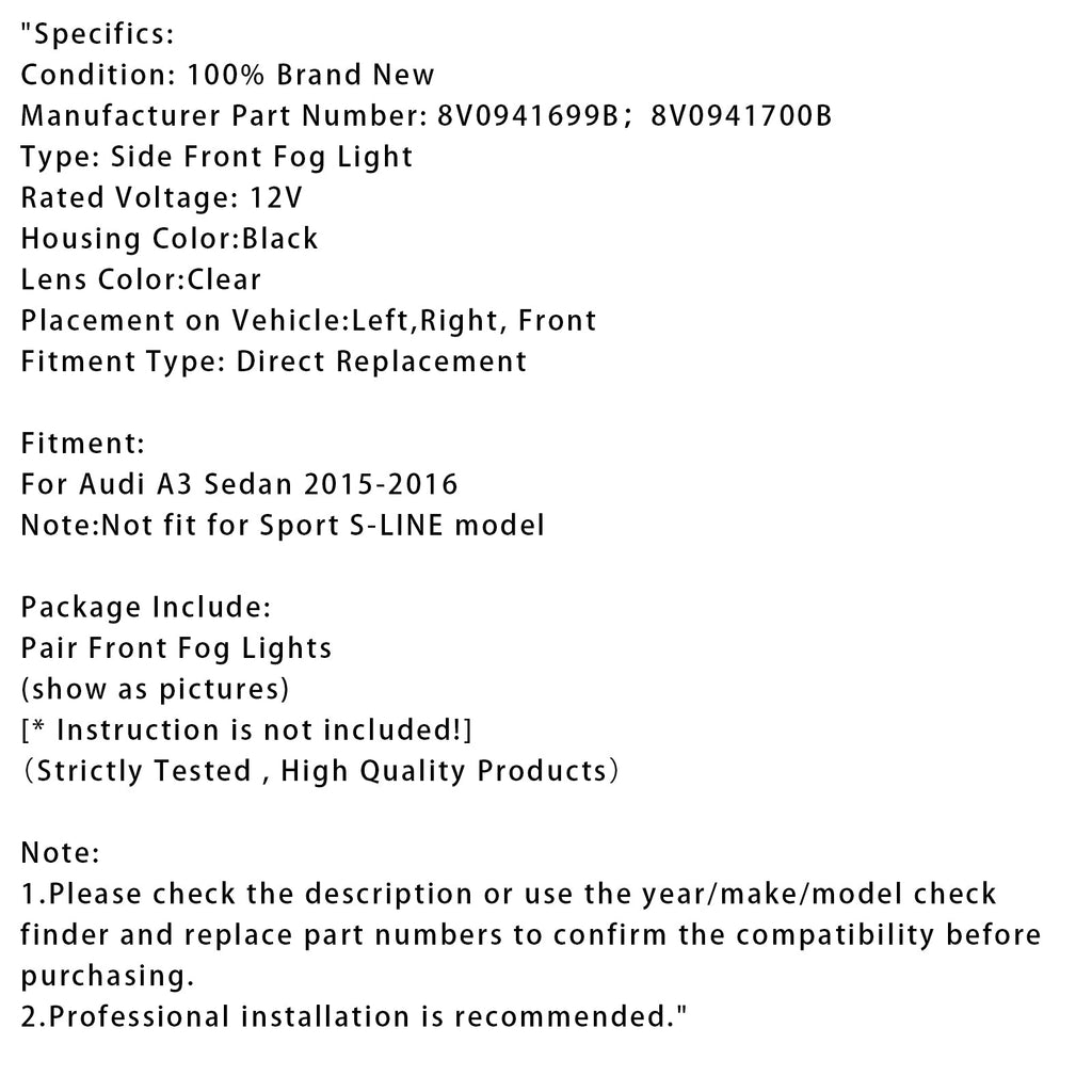 Pair Front Fog Light Lamps With Bulbs For Audi A3 Saloon 8V0941699B 2015-2016