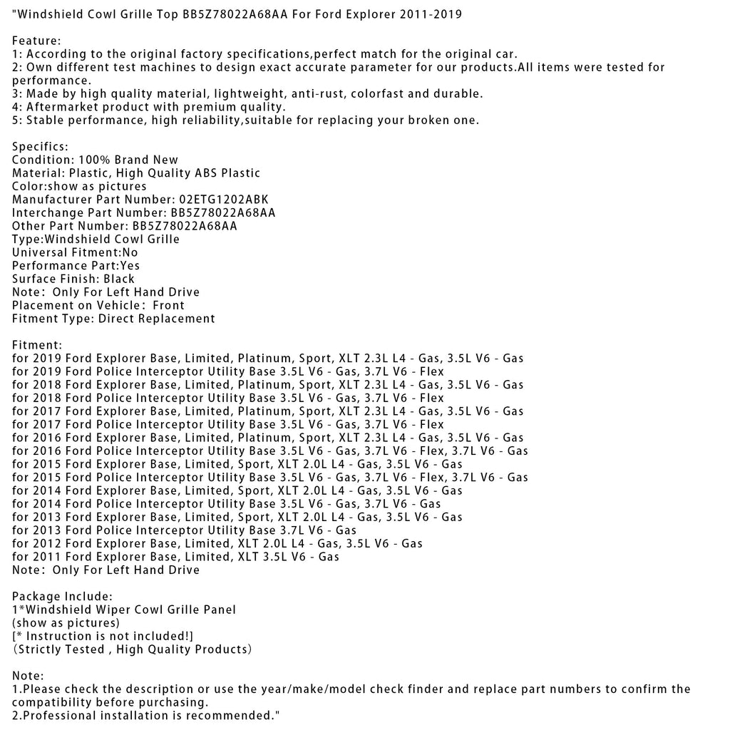 Windshield Cowl Grille Top BB5Z78022A68AA For Ford Explorer 2011-2019
