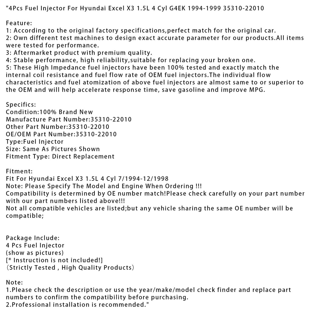 4Pcs Fuel Injector Fit For Hyundai Excel X3 1.5L 4 Cyl G4EK 1994-1999 35310-22010