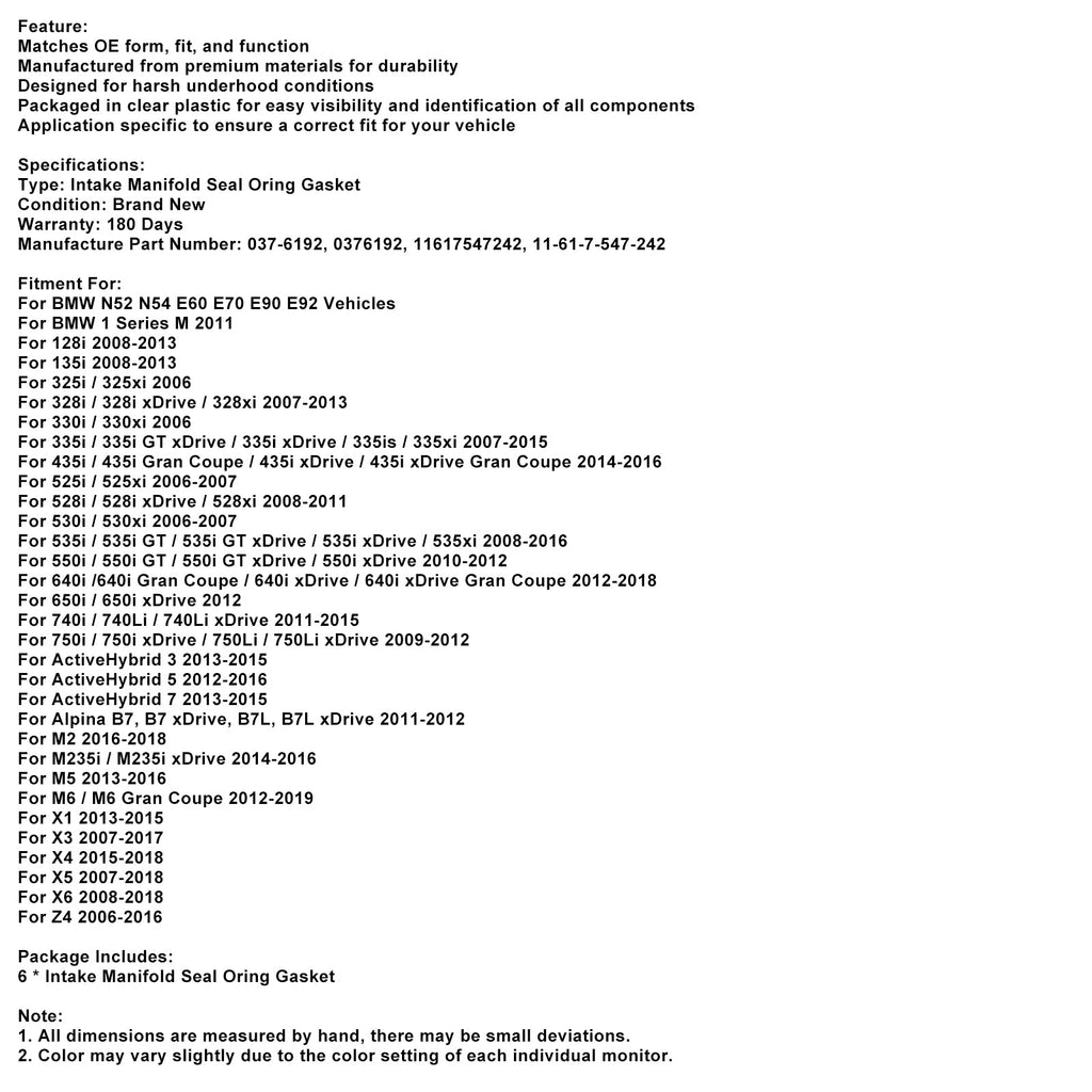 6PCS Intake Manifold Gasket Set 037-6192 Fit BMW E70 E90 E92 X4 X5 X6 3er 5er