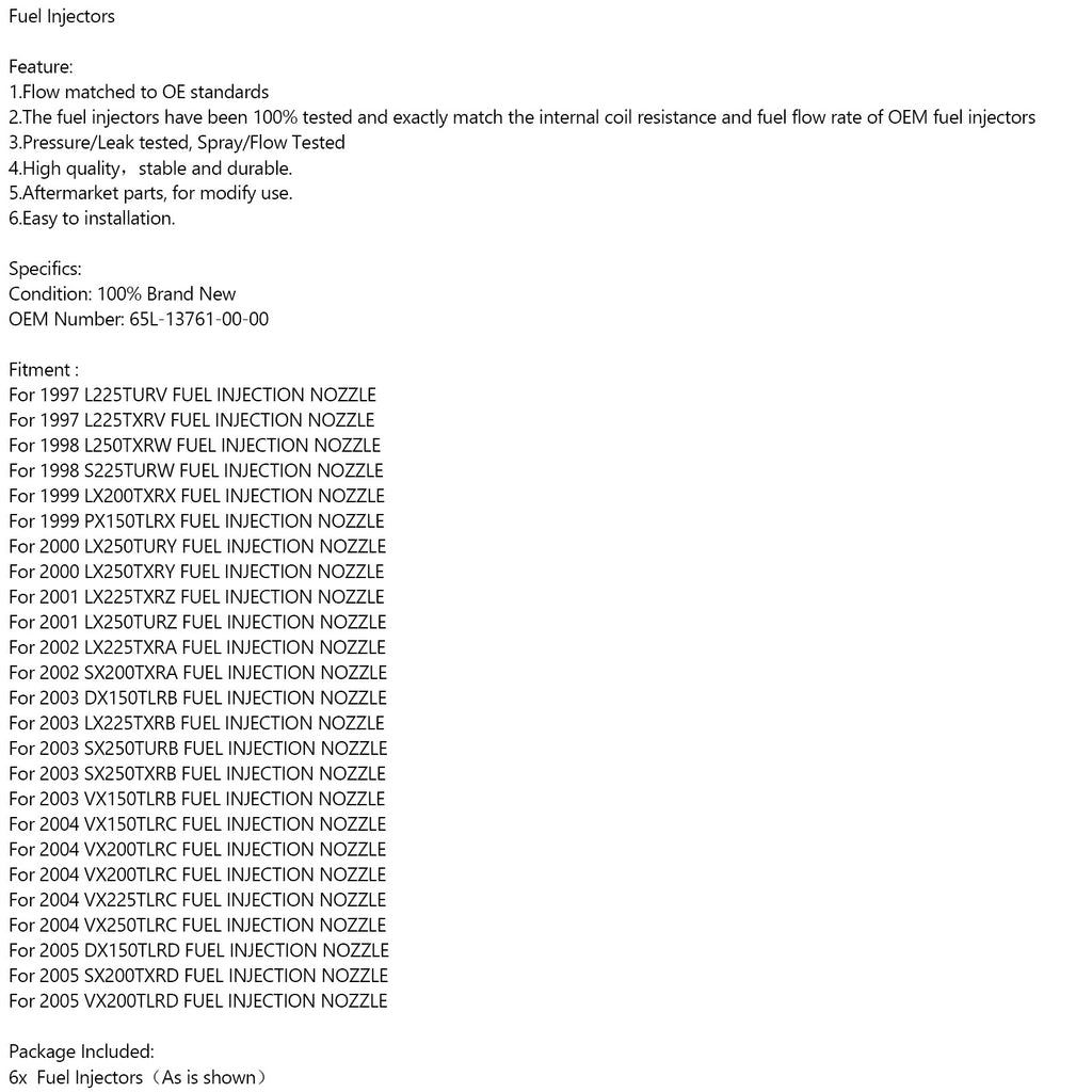 6PCS Yamaha 150/200/225 HP 2 Stroke Fuel Injector 65L-13761-00-00