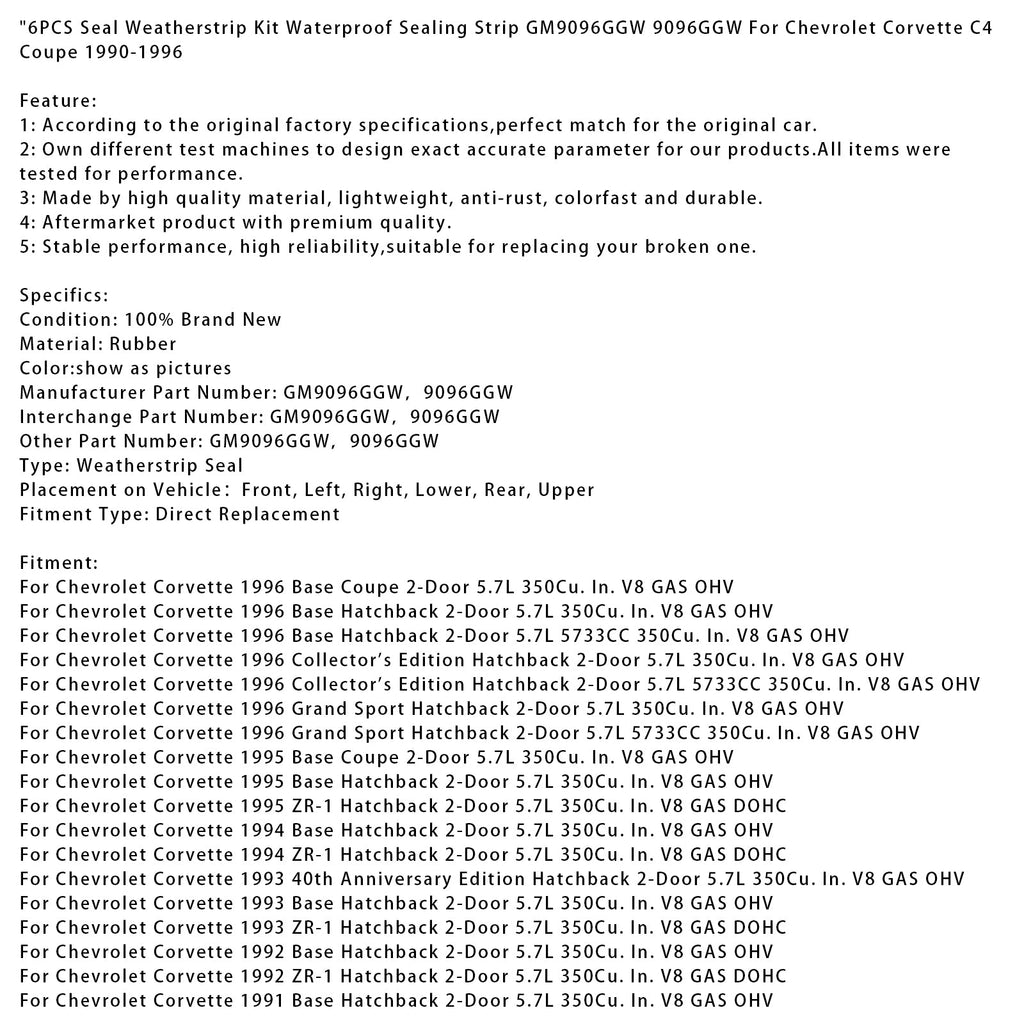 6PCS Seal Weatherstrip Kit Waterproof Sealing Strip GM9096GGW 9096GGW For Chevrolet Corvette C4 Coupe 1990-1996