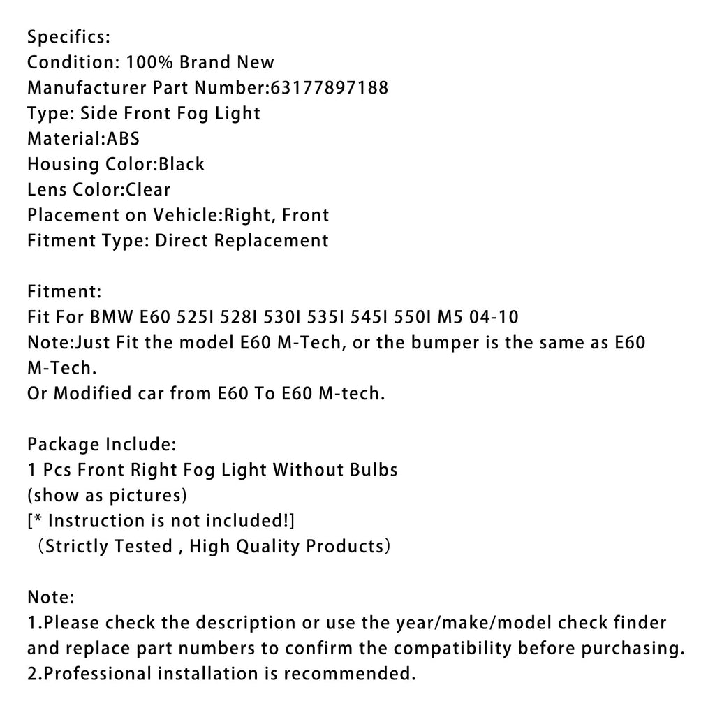 1X Right Fog Light Fit For BMW E60 525I 528I 530I 535I 545I M5 2004-2010 63177897188