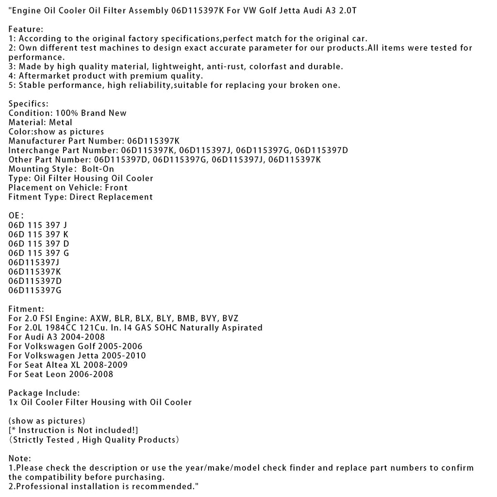 Engine Oil Cooler Oil Filter Assembly 06D115397K For VW Golf Jetta Audi A3 2.0T