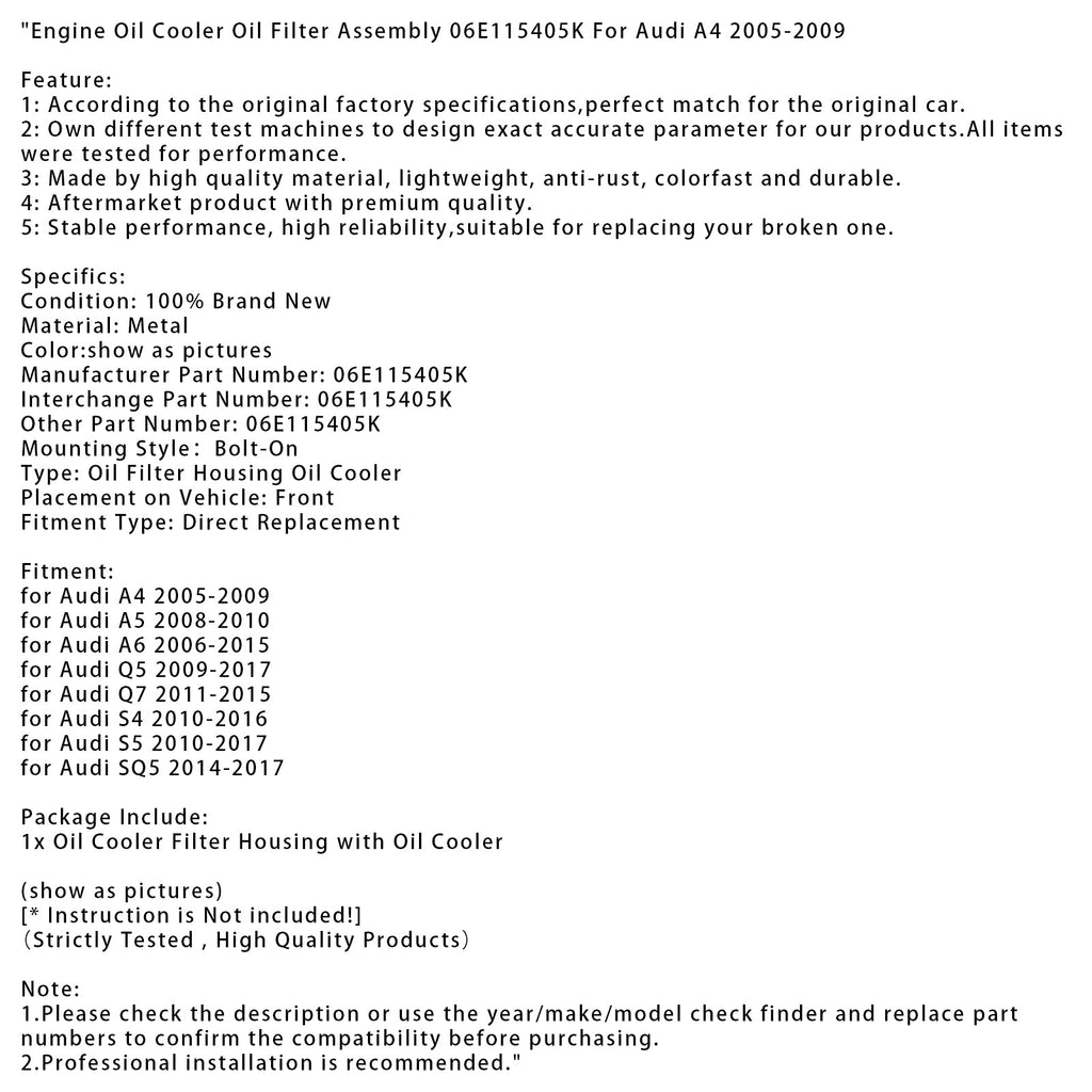 Engine Oil Cooler Oil Filter Assembly 06E115405K For Audi A4 2005-2009