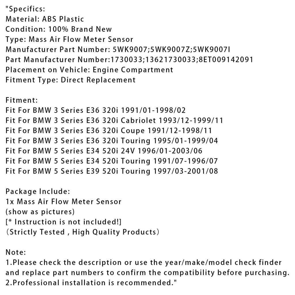 Mass Air Flow Meter Sensor For BMW E36 E34 E39 320i 520i 5WK9007