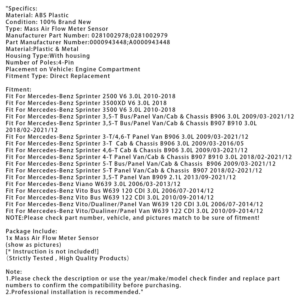 Mass Air Flow Meter Sensor For Mercedes Sprinter 2500 3500 3.0L V6 0281002978