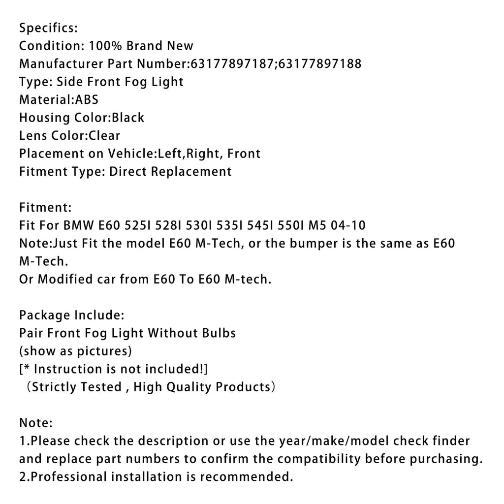 Pair Front Fog Light For BMW E60 525I 530I 535I 545I 550I M5 2004-2010 63177897187