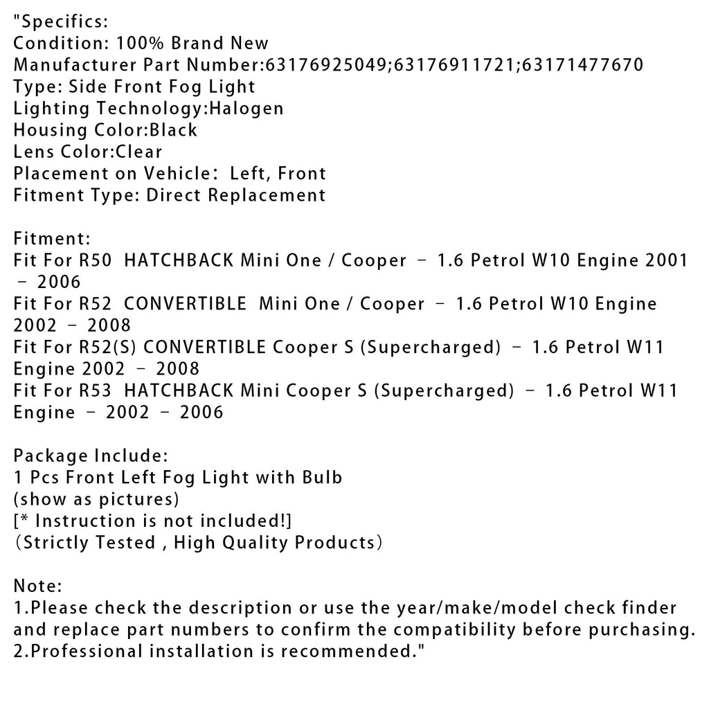 1 Pcs Front Bumper Left Fog Light For Mini Cooper One R50 R52 R53 63176925049