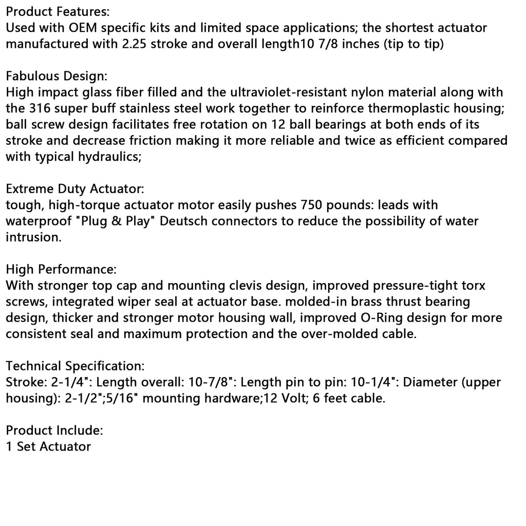 tough, high-torque actuator motor easily pushes 750 pounds: leads with waterproof "Plug & Play" Deutsch connectors to reduce the possibility of water intrusion.