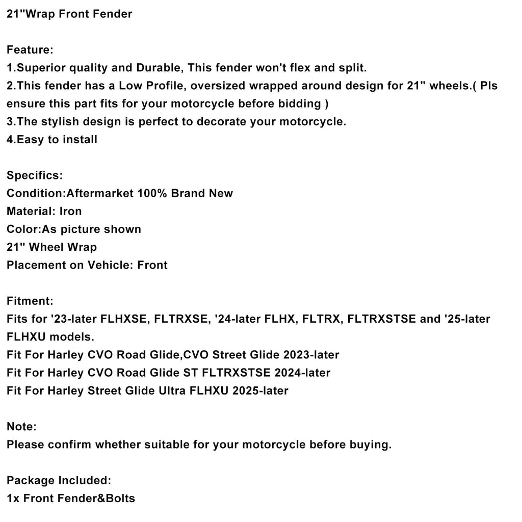 2.This fender has a Low Profile, oversized wrapped around design for 21" wheels.( Pls ensure this part fits for your motorcycle before bidding )