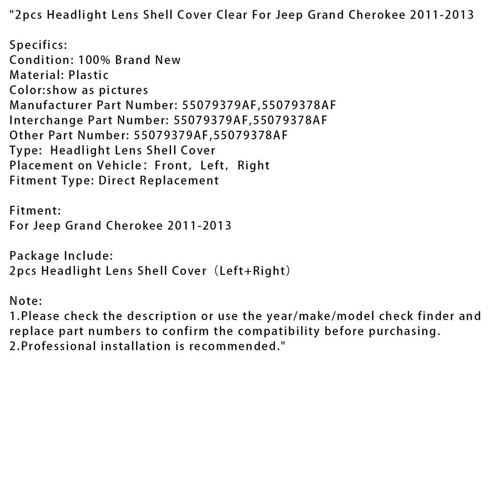 2011-2013 Jeep Grand Cherokee 2pcs Headlight Lens Shell Cover Clear