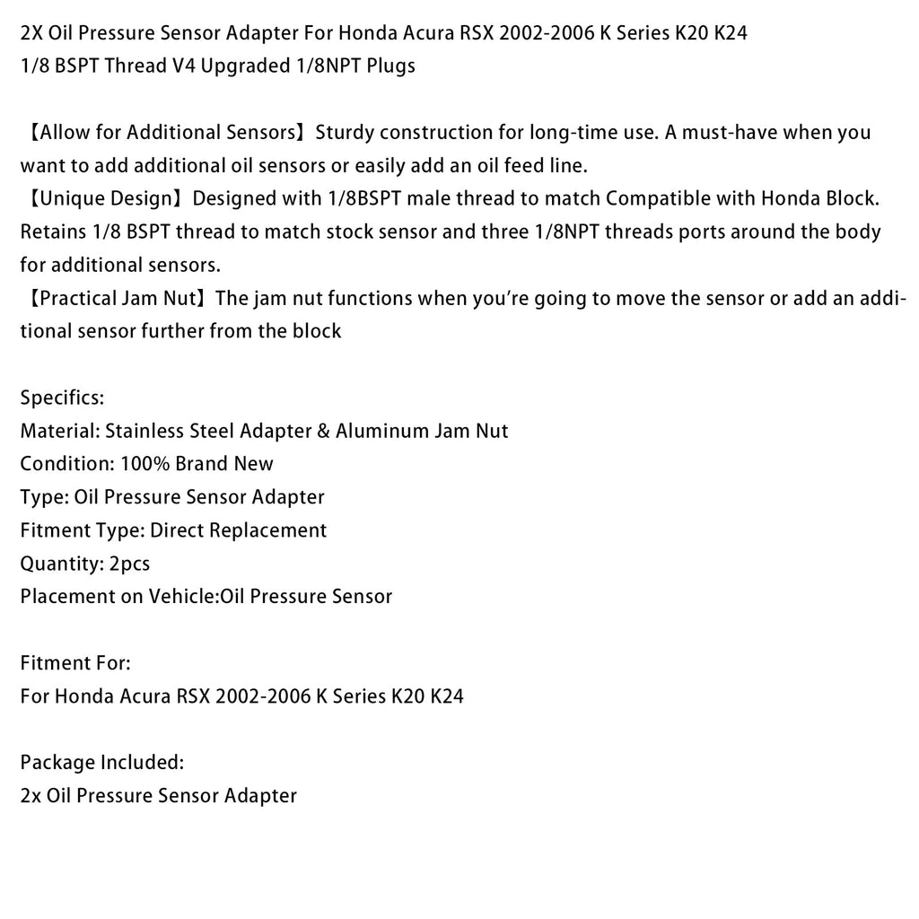 2X Oil Pressure Sensor Adapter For Honda Acura RSX 2002-2006 K Series K20 K24