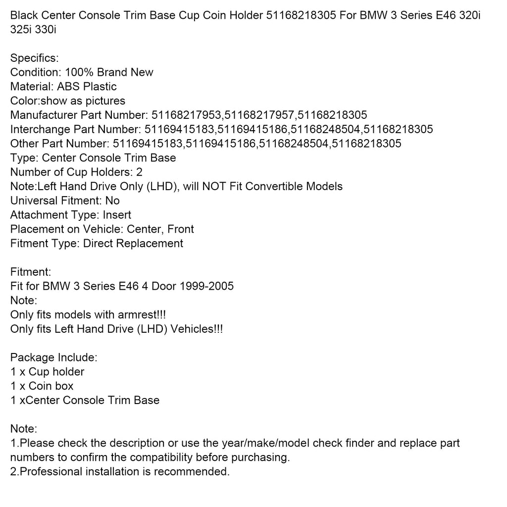Black Center Console Trim Base Cup Coin Holder 51168218305 For BMW 3 Series E46 320i 325i 330i