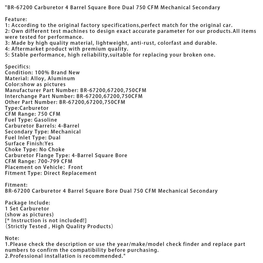 BR-67200 Carburetor 4 Barrel Square Bore Dual 750 CFM Mechanical Secondary
