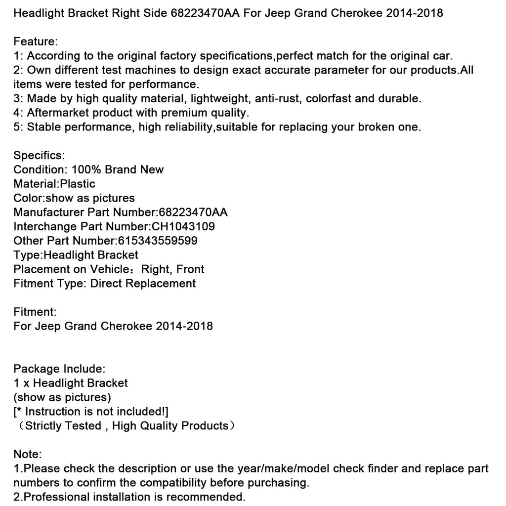 Headlight Bracket Right Side 68223470AA Fit For Jeep Grand Cherokee 2014-2018