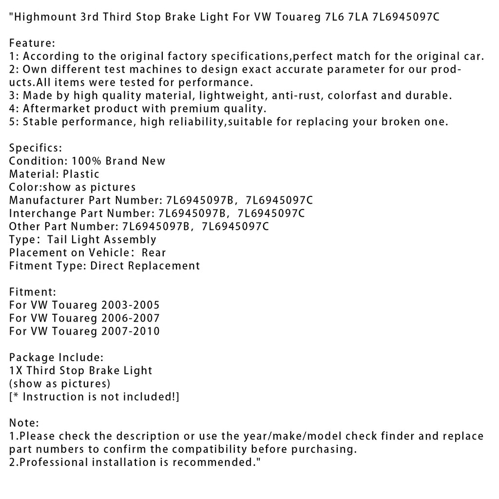 Highmount 3rd Third Stop Brake Light Fit For VW Touareg 7L6 7LA 7L6945097C