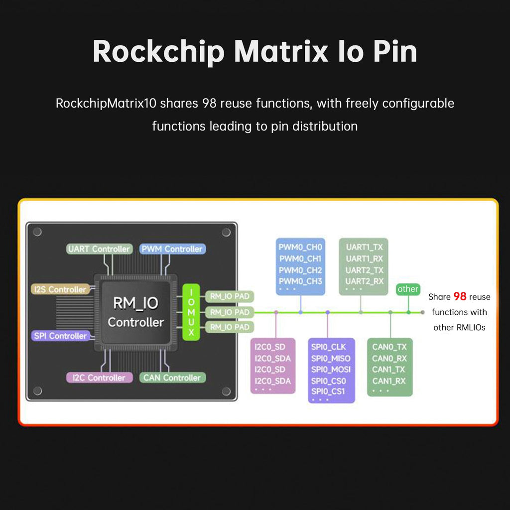 The low-speed interface adopts Rockchip's Rockchip Matrix 10 design, which allows rich multiplexing functions to share limited chip pins, making peripheral circuit adaptation more flexible