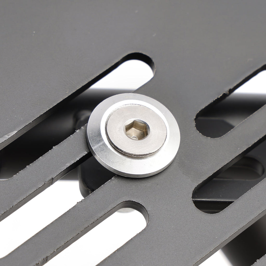 Made of 3mm aluminum, with integrated slots for seat belt, incl. mounting hardware for mounting on existing luggage racks.