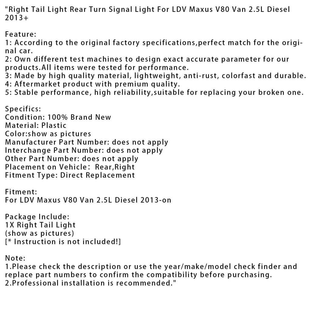 Right Tail Light Rear Turn Signal Light Fit For LDV Maxus V80 Van 2.5L Diesel 2013+