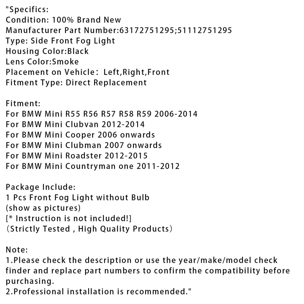 1 Pcs Front Bumper Fog Light For Mini R55 R56 R58 R59 R60 63172751295 Smoke Lens