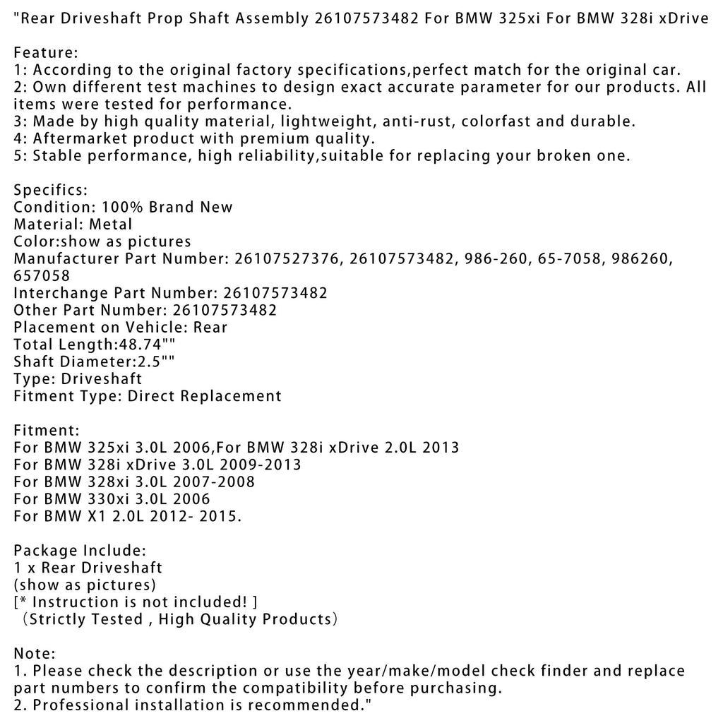 Rear Driveshaft Prop Shaft Assembly 26107573482 For BMW 325xi For BMW 328i xDrive