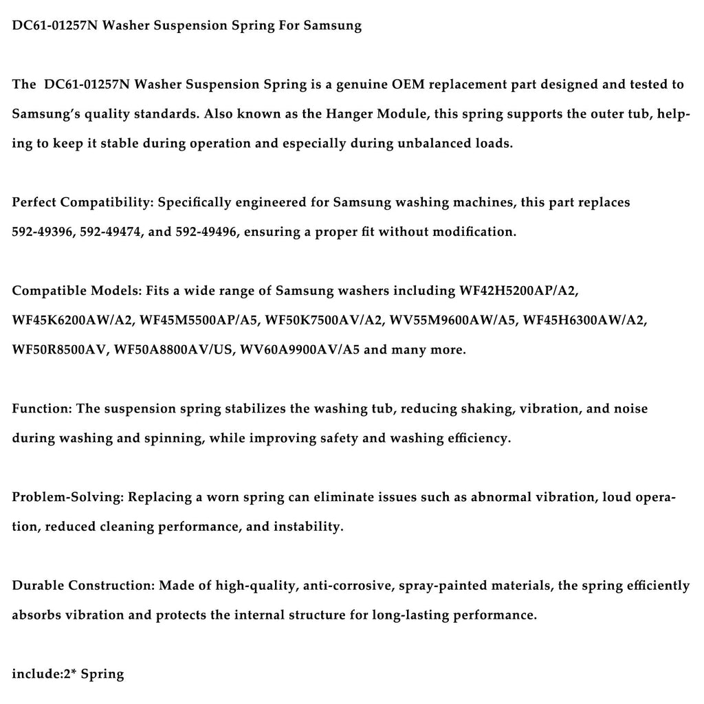 The DC61-01257N Washer Suspension Spring is a genuine OEM replacement part designed and tested to Samsung’s quality standards. Also known as the Hanger Module, this spring supports the outer tub, helping to keep it stable during operation and especially during unbalanced loads.