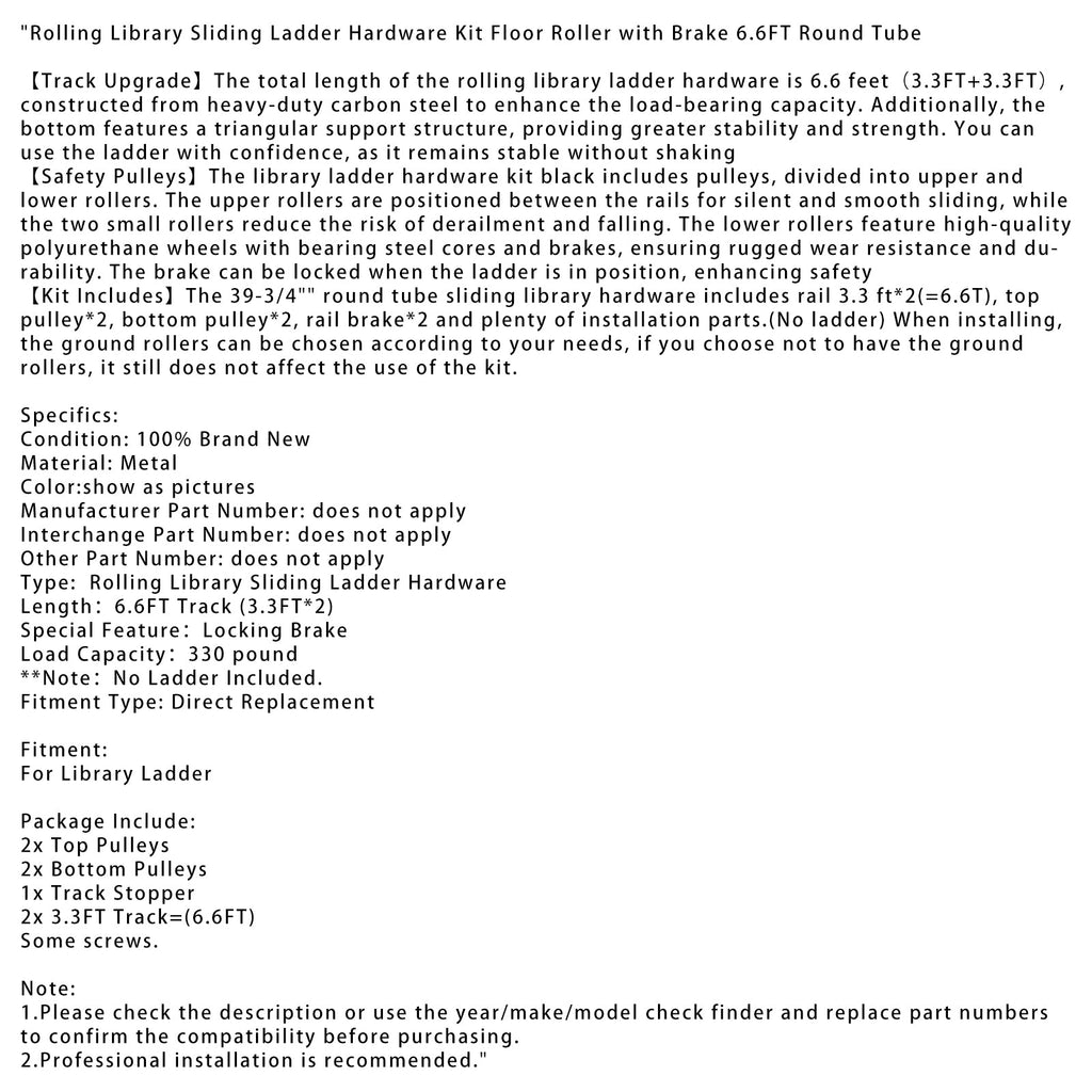【Kit Includes】The 39-3/4" round tube sliding library hardware includes rail 3.3 ft*2(=6.6T), top pulley*2, bottom pulley*2, rail brake*2 and plenty of installation parts.(No ladder) When installing, the ground rollers can be chosen according to your needs, if you choose not to have the ground rollers, it still does not affect the use of the kit.