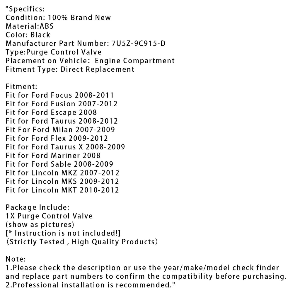 EVAP Vapor Canister Purge Control Valve For Ford Focus Fusion 7U5Z-9C915-D