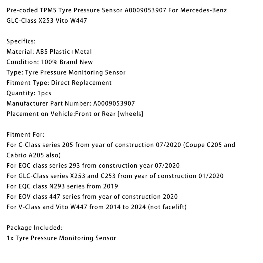 Pre-coded TPMS Tyre Pressure Sensor A0009053907 For Mercedes-Benz GLC-Class X253 Vito W447