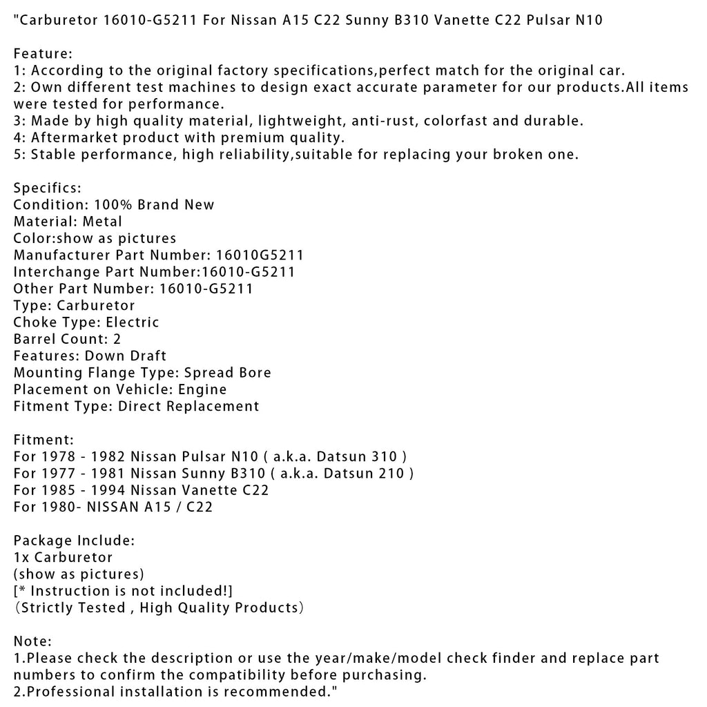 Carburetor 16010-G5211 For Nissan A15 C22 Sunny B310 Vanette C22 Pulsar N10