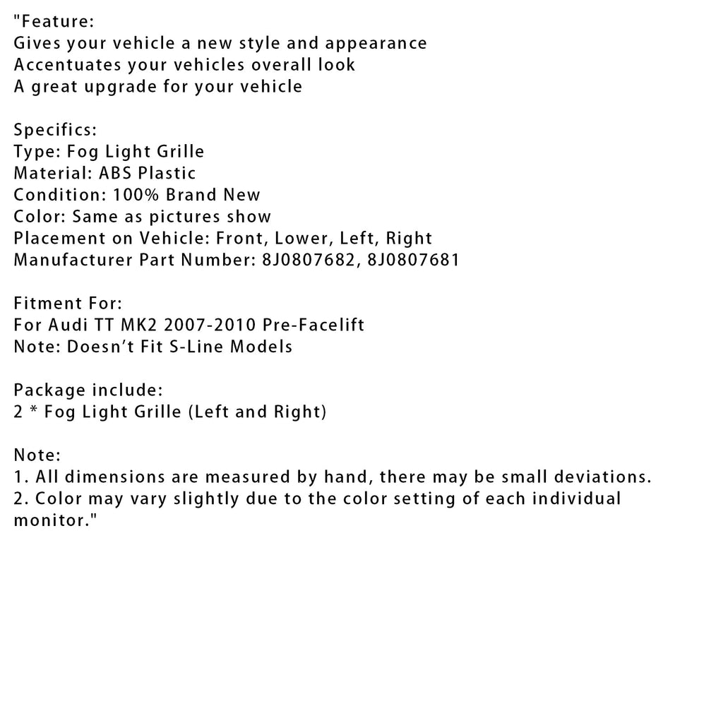 2007-2010 Audi TT MK2 2PCS Fog Light Cover Grille Grill 8J0807682