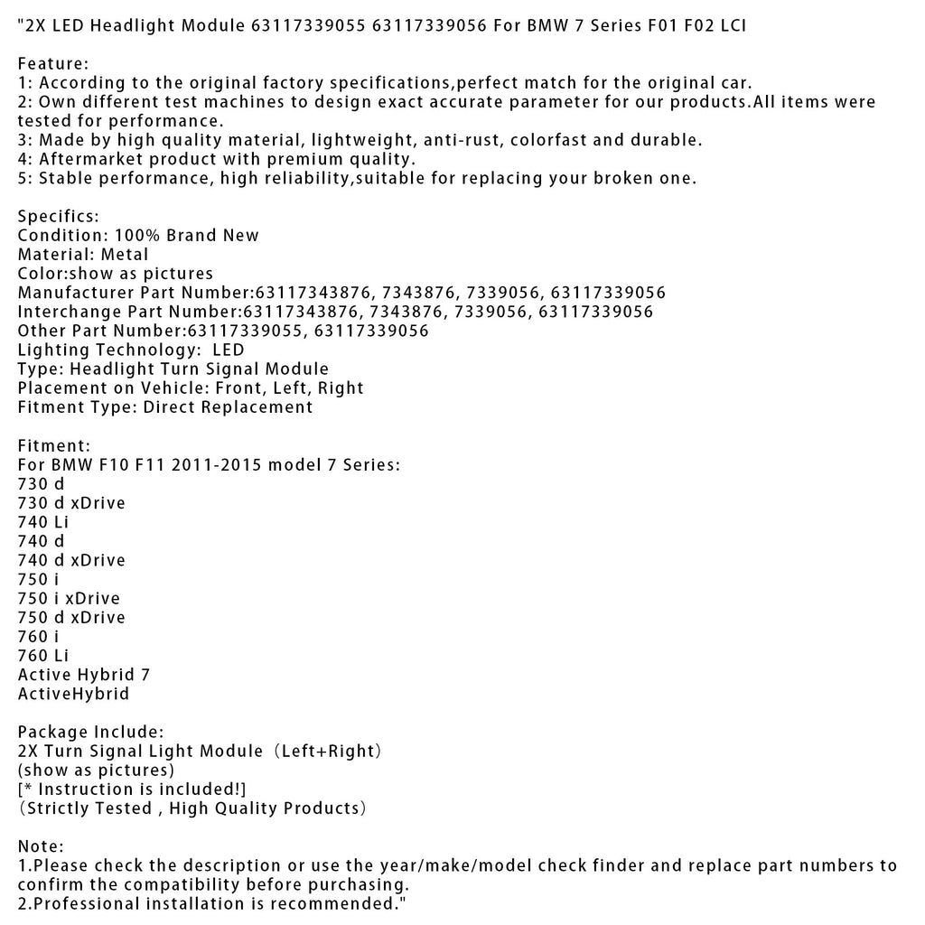 2X LED Headlight Module 63117339055 56 For BMW 7 Series F01 F02 LCI