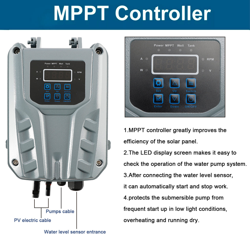 【High-quality MPPT Controller]: The solar water pump controller utilizing MPPT technology to ensure maximum flow is delivered under all light conditions. It also protects the submersible pump from frequent start up in low light conditions, overheating & running dry with LED display to view working various condition.
