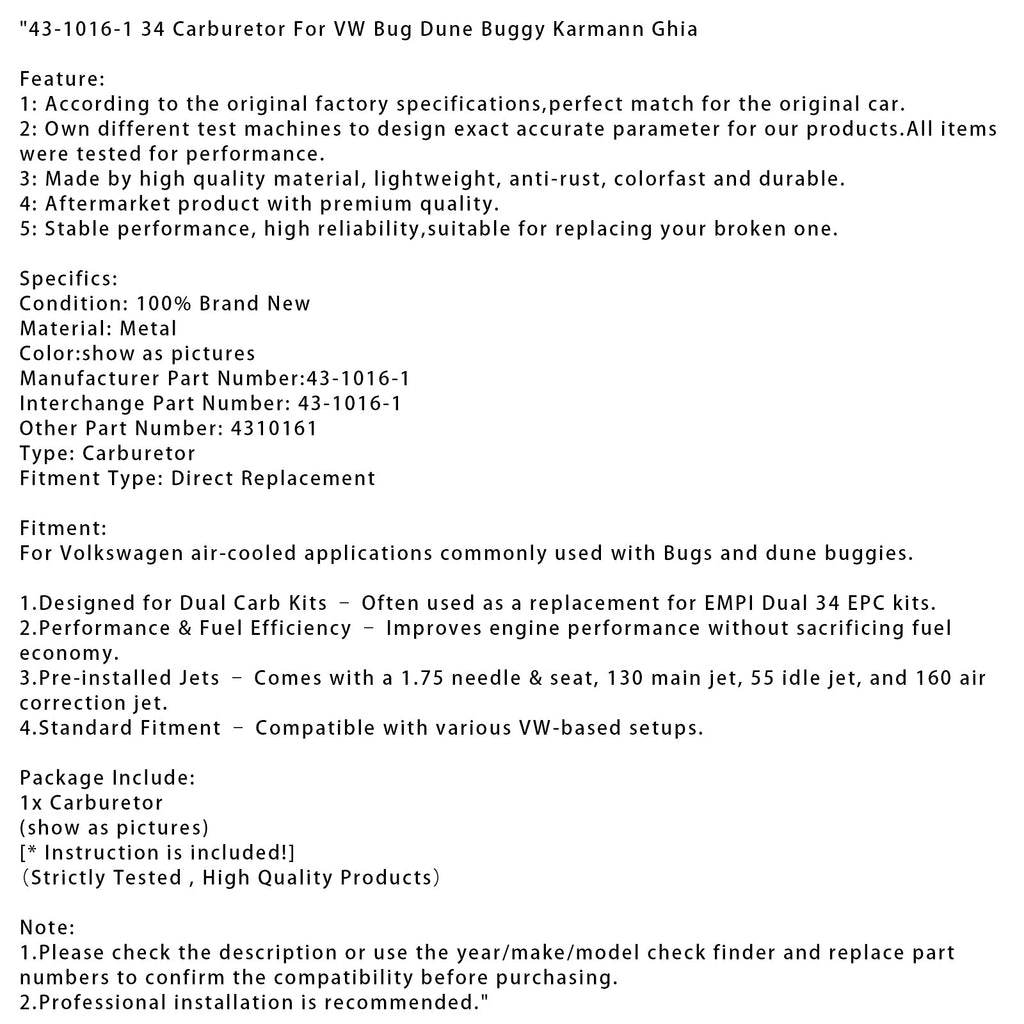 43-1016-1 34 Carburetor For VW Bug Dune Buggy Karmann Ghia