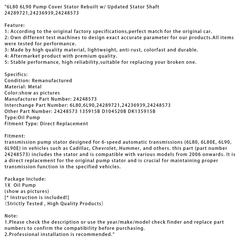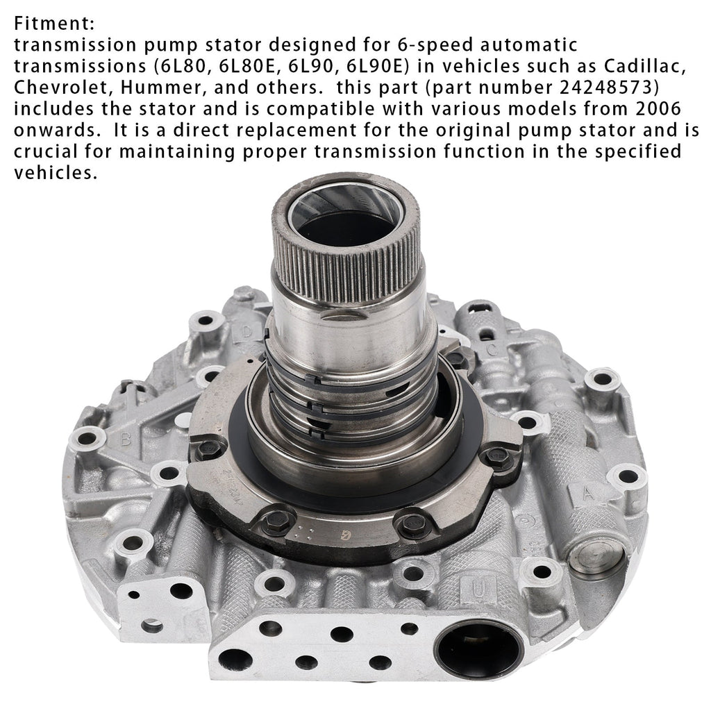 transmission pump stator designed for 6-speed automatic transmissions (6L80, 6L80E, 6L90, 6L90E) in vehicles such as Cadillac, Chevrolet, Hummer, and others. this part (part number 24248573) includes the stator and is compatible with various models from 2006 onwards. It is a direct replacement for the original pump stator and is crucial for maintaining proper transmission function in the specified vehicles.
