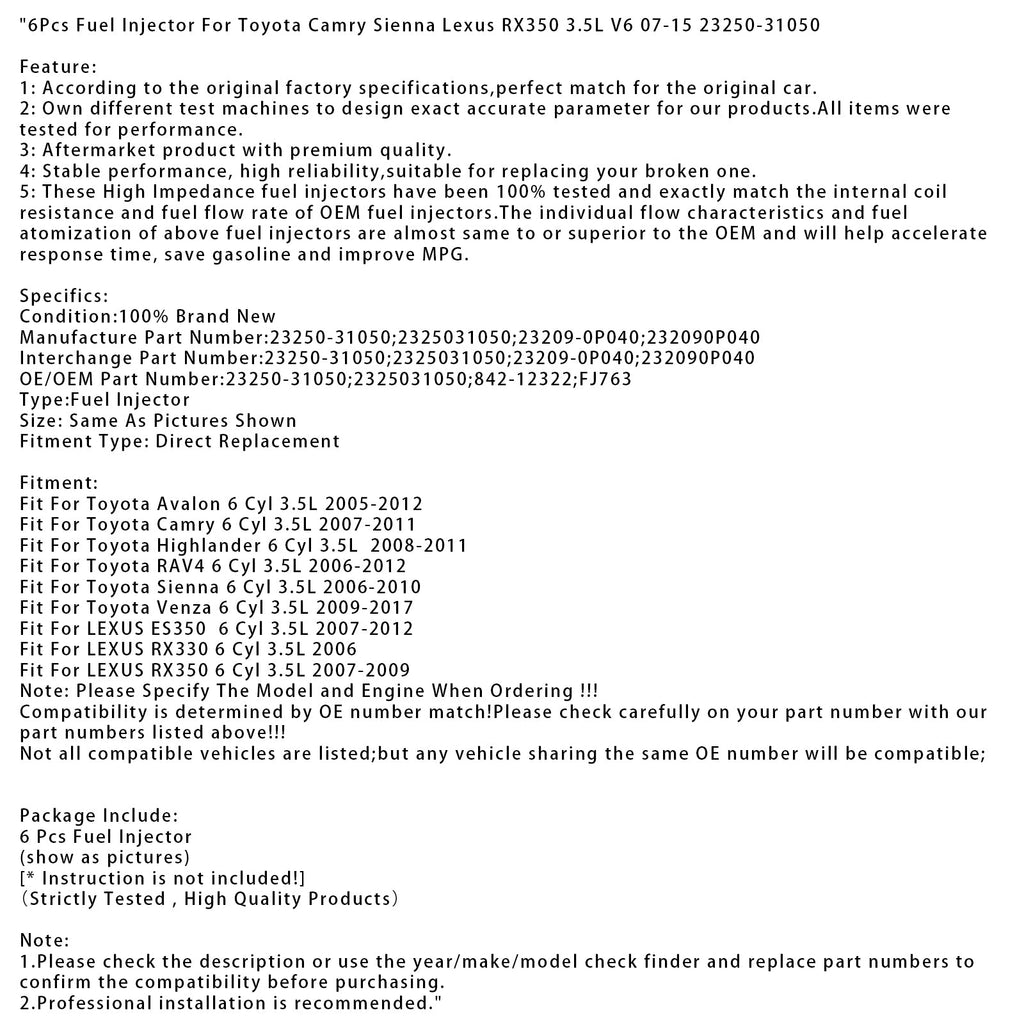 6Pcs Fuel Injector For Toyota Camry Sienna Lexus RX350 3.5L V6 07-15 23250-31050