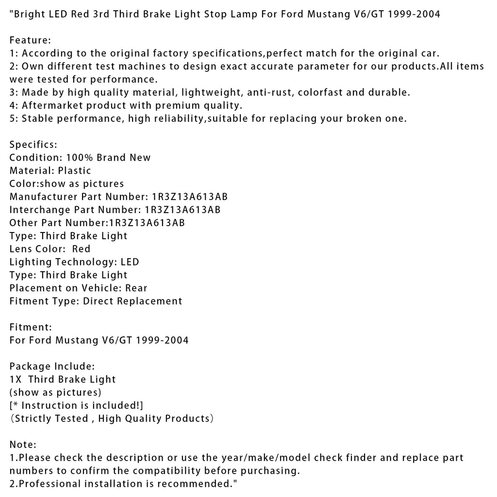 Bright LED Red 3rd Third Brake Light Stop Lamp For Ford Mustang V6/GT 1999-2004