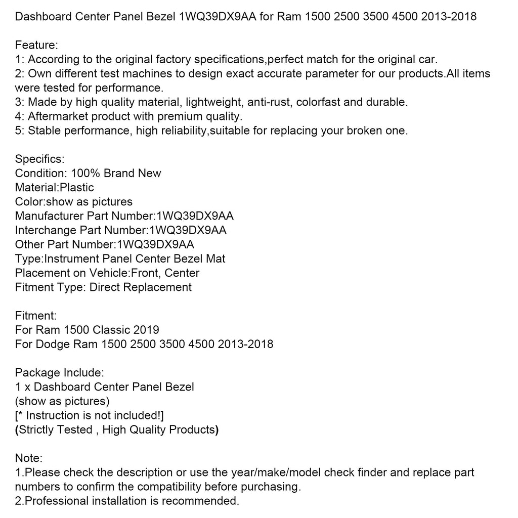 Dashboard Center Panel Bezel 1WQ39DX9AA for Ram 1500 2500 3500 4500 2013-2018