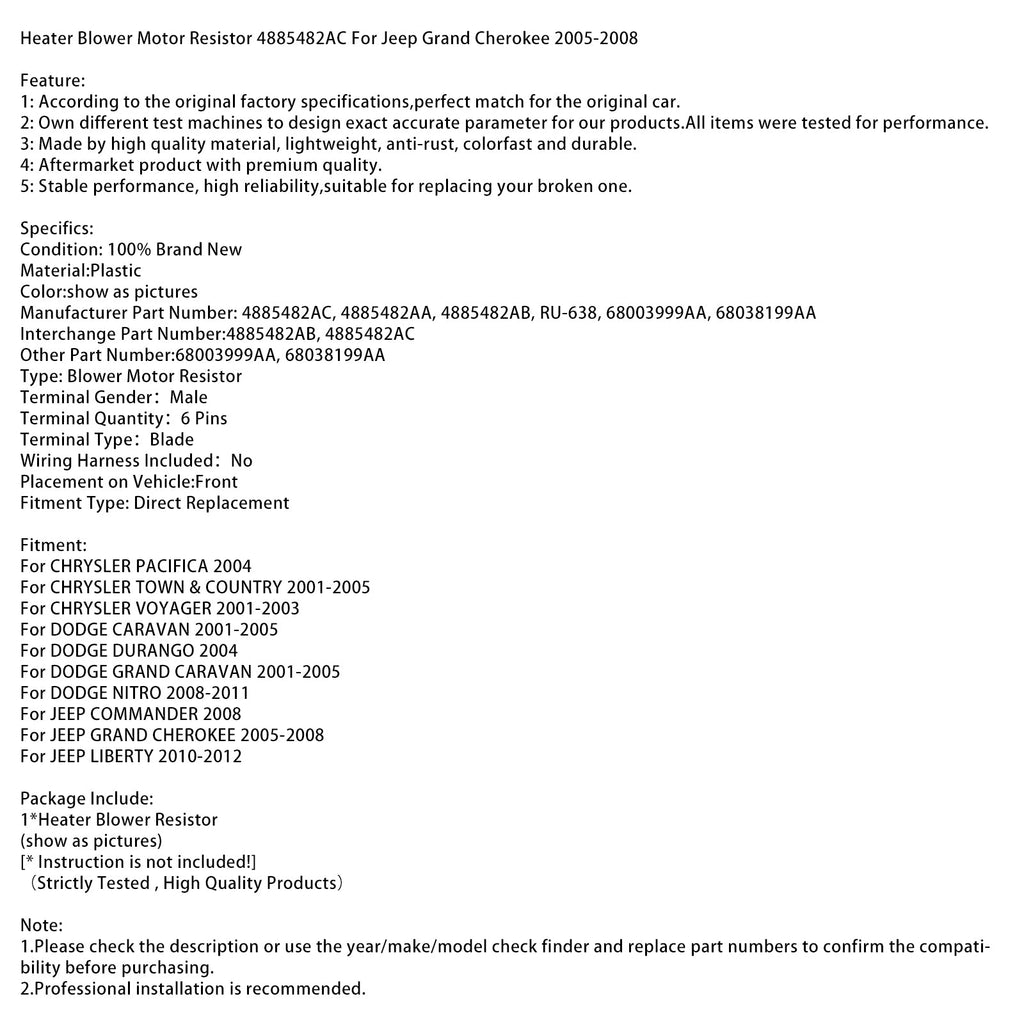 Heater Blower Motor Resistor 4885482AC For Jeep Grand Cherokee 2005-2008