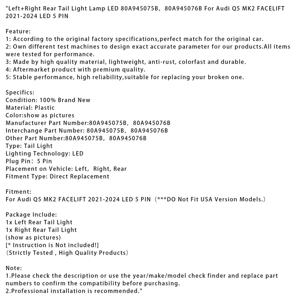 Left+Right Rear Tail Light Lamp LED 80A945075B,80A945076B Fit For Audi Q5 MK2 FACELIFT 2021-2024 LED 5 PIN